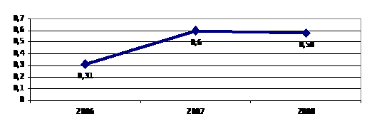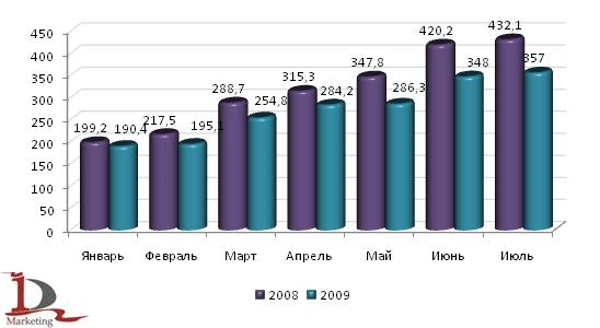 Кроме того, уменьшение объемов инвестиций и сохраняющийся недостаток заемных средств, при большой зависимости строительной отрасли от банков, отражаются на объемах строительных работ. Финансовые результаты чрезвычайно снизились – за первые пять месяцев года прибыль составила 13,1 млрд. рублей, что ниже результатов прошлого года более чем на 60%. Объем работ по виду деятельности «Строительство» в июле 2009г. остановился на отметке 357 млрд.рублей, что ниже прошлогоднего показателя на 17,8%. Несмотря на отрицательные сравнения с успешным 2008 годом – возрастающий тренд все-таки прослеживается с начала 2009 года в соответствии с сезонными тенденциями. Влияние кризиса не оказалось для строителей столь пагубным, как предсказывалось в 2008, однако, размер среднего отставания показателей объемов работ 2009 года в ежемесячном разрезе составил около 13%.