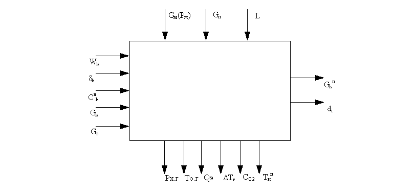 К входным параметрам процесса можно отнести качественные показатели (влажность – W>k>, крупность – δ>k>, содержание летучих – Cл>k>), загружаемого сырого кокса и его количество – G>k>, расход вторичного воздуха – G>в>, а также действующие на печь возмущения (рисунок 3).