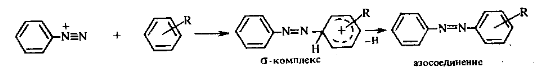 Установлено, что реакция азосочетания протекает по механизму электрофильного замещения, в котором атакующим агентом выступает ион диазония (Аг—N=N),а субстратом — ароматические системы, содержащие в п- или о-положении заместители NH>2>, NHAlk, NHAr, N(Alk)>2>, NHSO>3>H, NHNO>2>, ОН и в некоторых случаях OAlk: