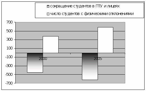 С 2000 г. по 2004 г. число выпускников промышленных специальностей сократилось более чем в 1,5 раза, а сельскохозяйственных в 1,7% раз (общероссийские показатели составили 1,07 и 1,2 соответственно). С 2000 г. контингент профессиональных училищ и лицеев сократился на 450 человек. Количество принятых на обучение в 2005 г. сократилось по сравнению с 623 человека. На фоне уменьшения общего контингента увеличилось число обучающихся, имеющих отклонения в здоровье (в 2000 году – 377 человек, 2005 году – 590 человек) (диаграмма № 2)