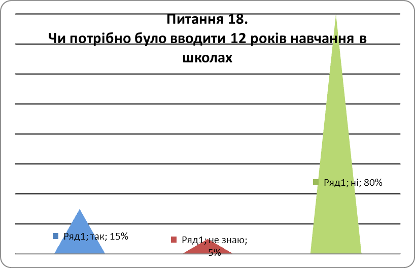 абсолютна більшість опитаних студентів (80 %) засвідчила, що не вважає запровадження 12-річної системи навчання у середній школі, вірним кроком. 15 % респондентів думають, що це правильний крок, на шляху до реформування системи освіти;