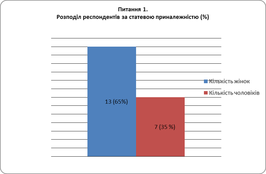 Вибірку даного соціологічного дослідження становили 20 респондентів. З діаграми видно, що більшість, це жінки (65 %), а чоловіки – 35 %.