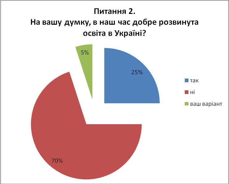 більшість студентів (70 %), вважають, що на данний час система освіти в Україні знаходиться не на достатньому рівні розвитку;