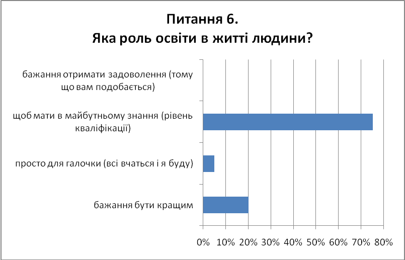 більша частина опитаних студентів – 75 %, зазначили, що основна роль освіти – це здобуття знань на майбутнє (рівень кваліфікації);