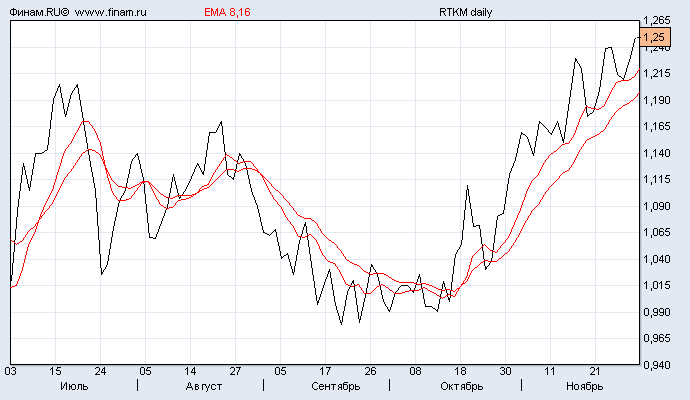 Тогда на свет появились экспоненциальные скользящие средние (EMA). Их отличие как раз и заключается в том, что больший вес при расчете среднего значения за период придается недавним данным, а вес старых данных уменьшен. Чем короче интервал наблюдения, а следовательно, больше экспонента, чувствительность ЕМА возрастает, и если это становится негативным фактором, то единственно верным решением будет расширение периода наблюдений, другими словами, использование приема сглаживания кривой ЕМА переходом на другую экспоненту. Это можно делать и во второй и третий раз, помня лишь о том, что не соответствующее анализируемому рыночному циклу расширение интервала ЕМА ведет к потере ее чувствительности.