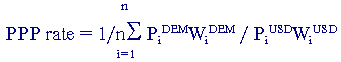 В самом простом виде, абстрагируясь от реальных объемов торговли и долей разных товаров в структуре потребления, формула нахождения курса по паритету покупательной способности может выглядеть следующим образом:
