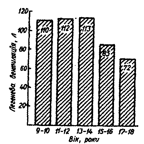 Рис 1. Сумарна величина легеневої вентиляції при однаковій роботі в учнів різного віку (за І. Н екером)