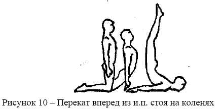 б) стоя на коленях, руки вниз ладонями вперед и сильно прогнуться. Подавая таз вперед, перекатиться вперед, последовательно касаясь мата бедрами, животом и грудью (рис. 10). Обратным движением возвратиться в упор лежа на бедрах.