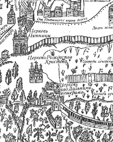 Наступне зображення споруд на Дальніх печер бачимо на одній з гравюр до книги Афанасія Кальнофойського “Тератургіма” (печерське видання 1638 року). Ця гравюра (рис.2) має панорамний характер (вигляд зі сходу) і значно інформативніша від попередньої. Вона зображає весь дніпровський схил, в якому викопані Феодосієві печери, від берега річки до самої вершини пагорба. Домінантою ансамблю на Дальніх печерах є дерев’яна церква Різдва Богородиці, що, очевидно, замінила попередню каплицю. За даними “Тератургіми”, вона була зведена в 1635 році. Церква тридільна (неф із двома вікнами помітно вищий від вівтаря та бабинця), три банна, з галереєю (так званим опасанням) у нижній частині. Її архітектура типова для дерев’яного будівництва України цього періоду [6; c.107-124]. На захід від неї – кладовище з деревами (могильні горбки показані як темні прямокутники). На гравюрі бачимо також будиночки – келії ченців: один – “келія старця печерника” на пізнішому плані 1661 року – десь у районі теперішньої церкви Зачаття Ганни (із заходу до нього примикає город, поділений на окремі грядки); іще два (один з них, можливо, господарського призначення) – в західній частині території, недалеко від в’їзних воріт (на плані 1661 року позначений, як “келія схимничеська”). Неподалік із перших згаданих будинків – криниця з журавлем.