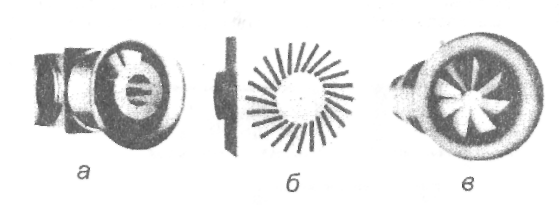 а - круглий з нерухомими лопатями; б- квадратний з поворотними лопатями; в- плафон з обертовим ротором