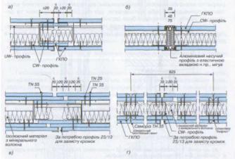 В наведених прикладах виконання деформаційних швів направляючі профілі каркасу перегородки (UW) розрізають по довжині, передбачаючи можливість розсування (збільшення ширини шва). Зазвичай ширина шва становить 20 мм, хоча при використанні спеціального стоякового профіля "Мігуа" відстань між листами гіпсокартона може становити 35, 48, 75 мм (18,6). Для забезпечення надійної звукоізоляції в швах розміщують волокнистий звукоізоляційний матеріал, кромки ГКП захищають профілі 23/13.