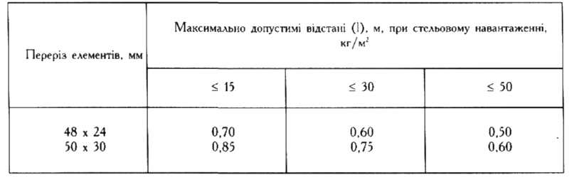 Таблиця 5. Максимальні допустимі відстані (І) між несучими елементами дерев'яного каркасу