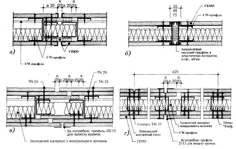 У зв'язку з можливістю лінійного розширення або стиснення перегородок (при їхній значній довжині) в умовах значних виробничих або сезонних перепадів температури повітря в приміщеннях передбачається улаштування деформаційних швів, які б відвертали появу тріщин в швах між ГКП, біля дверних отворів і в місцях стикування перегородок з несучими стінами. Необхідність у влаштуванні температурних швів з'являється вже тоді, коли загальна довжина перегородки перевищує 15 м. Зрозуміло, що температурні шви повинні перерізати перегородку наскрізь і, в той же час, обидві частини перегородки, що знаходяться обабіч шва, повинні мати пружний зв'язок між собою. Окрім цього, конструкція шва повинна бути такою, щоб були забезпечені належні звукоізоляція приміщень та необхідна вогнестійкість перегородки у місці розташування шва. Такі конструкції деформаційних швів (рис. 5.19) були розроблені і випробувані спеціалістами.