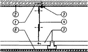 1 - анкер (дюбель), шуруп; 2 -несуче перекриття; З - з'єднувальний елемент; 4 - підвіс; 5 - каркас; 6 - ГКП