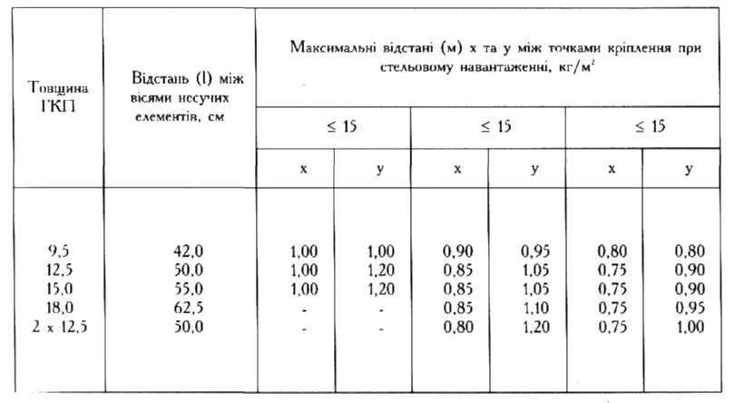 Таблиця 3. Максимальні відстані між точками кріплення основних елементів (х), несучих елементів (у) та між несучими елементами (І), виготовлених з профілю CD 60 х 27 х