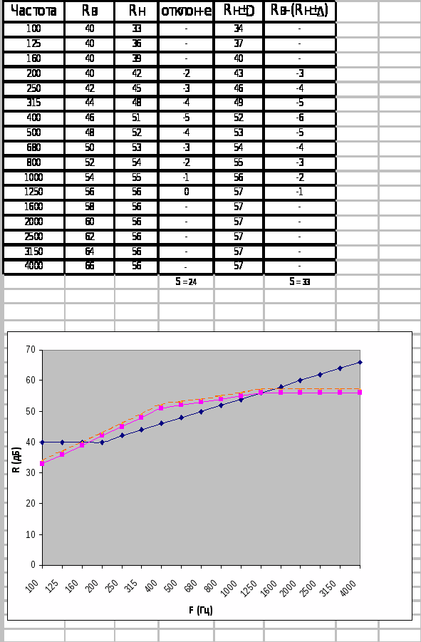 Т.к. сумма неблагоприятных отклонений меньше 32 (1=24 дБ) попробуем поднять оценочную кривую на целое число дБ так, чтобы сумма отклонений стремилась к 32, но не превышала её. В нашем случае оценочную кривую сместили на 1 дБ вверх (столбец 5, табл.3), и 2=33 дБ, т.е. превышает 32 дБ.