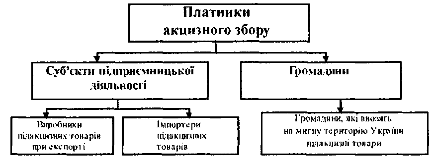 Залежно від суб'єкта сплати потрібно розрізняти два види акцизних зборів як митних платежів: акцизний збір, що нараховується за вантажною митною декларацією, та акцизний збір у неторговельному обороті. Акцизний збір в неторговельному обороті сплачують фізичні особи, які переміщують підакцизний товар через кордон. Платниками акцизного збору при експорті є суб'єкти підприємницької діяльності — українські виробники алкогольних напоїв та тютюнових виробів, а також замовники, за дорученням яких виготовляється ця продукція на давальницьких умовах. Платниками акцизного збору при імпорті товарів є суб'єкти підприємницької діяльності, в тому числі підприємства з іноземними інвестиціями, незалежно від дати їх реєстрації, та громадяни, що здійснюють підприємницьку діяльність без створення юридичної особи, і ввозять товари на митну територію України для власних, виробничих потреб або з метою продажу, реалізації на умовах комісії, а також реекспорту.