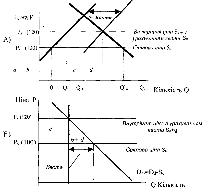 Оскільки головне завдання квоти зберегти не ціни, а обсяги імпорту на певному рівні, то, внаслідок підвищення попиту внутрішня ціна на товар збільшиться до рівня Р" >t>. Внутрішнє виробництво зросте до Q2>s> а споживання становитиме Q2>d>. При цьому величина імпорту залишиться незмінною в рамках квоти, тобто Q4 надаються можливості вітчизняній фірмі одержувати монопольні прибутки через встановлення високих цін. Тобто, квота, яка провокує монопольну ситуацію на внутрішньому ринку, призводить до встановлення надмірно високих цін, до зниження обсягів випуску продукції, що зумовлює більші національні втрати, ніж від митного тарифу.