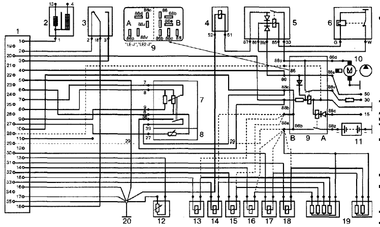 1 — разъем электронного блока управления, 2 — катушка зажигания, 3 — выключатель положения дроссельной заслонки, 4 — пусковая форсунка, 5 — реле пуска холодного двигателя (послестартовое реле), б — термореле, 7 — расходомер воздуха, 8 — датчик температуры поступающего воздуха, 9 — блок реле (питание системы впрыска и включение топливного насоса), 10 — топливный насос, 11 — аккумуляторная батарея, 12 — датчик температуры охлаждающей жидкости, 13—18 — рабочие форсунки (инжекторы), 19 — дополнительные резисторы, вариант без дополнительных резисторов показан штриховыми линиями ("LE-J"), 20 — главная точка соединения с "массой" (шпилька крепления впускного коллектора)