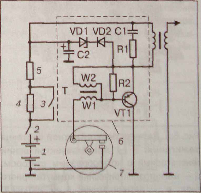 ТК 102: 1 аккумуляторная батарея; 2, 3 — контакты выключателя зажигания; 4,6 — добавочные резисторы; 6 — коммутатор; 7 — прерыватель