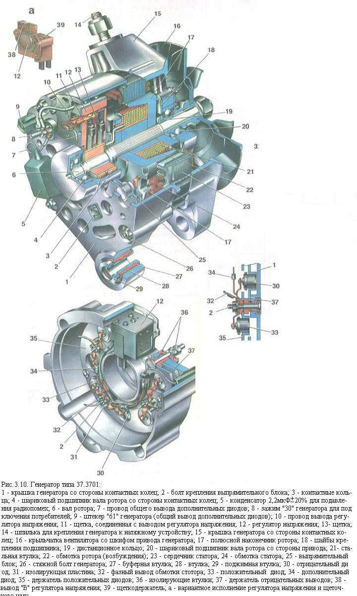 20 – контактные болты; 21 – вывод "положительных" щеток; 22 – скоба; 23 – щеткодержатель; 24 – "положительная" щетка; 25 – вал якоря; 26 – стяжная шпилька; 27 – задняя крышка с втулкой; 28 – коллектор; 29 – корпус; 30 – постоянный магнит; 31 – сердечник якоря; 32 – опора вала якоря с вкладышем; 33 – планетарная шестерня; 34 – центральная (ведущая) шестерня; 35 – водило; 36 – шестерня с внутренними зубьями; 37 – кольцо отводки; 38 – ступица с наружным кольцом обгонной муфты |
