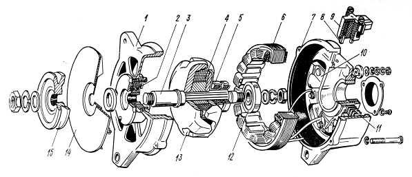 На рис. 1 показана будова генератора змінного струму Г-250. Генератор має статор 6 з трьохфазною обмоткою, виконану в вигляді окремих котушок, насаджених на зубці статора. В кожній фазі є по шість котушок, з’єднаних послідовно; фазні обмотки статора з’єднанні зіркою, їх вихідні клеми підключенні до випрямного блоку 10.