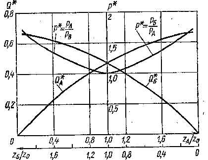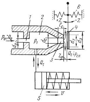 Жидкость подается к гидроусилителю со стороны нерегулируемого дросселя. Из междроссельной камеры одна часть жидкости Q>2> вытекает через щель, образованную торцом сопла и заслонкой, а другая Q>1 >поступает к исполнительному элементу. При изменении положения заслонки изменяются давление в междроссельной камере и расход через сопло. Одновременно изменяются усилие на исполнительный элемент, расход Q>1> и скорость υ движения выходного звена. Нерегулируемый дроссель может быть выполнен в виде пакета тонких шайб с круглыми отверстиями.