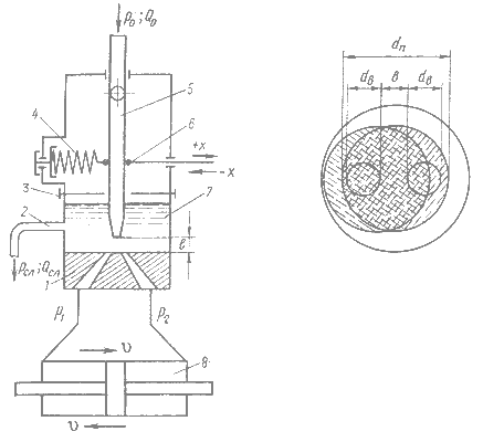 Гидроусилитель со струйной трубкой (рис.8.) состоит из трубки 5 с коническим насадком на конце, сопловой головки 1 с двумя наклонными коническими расходящимися каналами и устройства управления. Устройство управления струйной трубкой состоит из задающего устройства 4 в виде регулируемой пружины, толкателя 6 и ограничителя 3 хода струйной трубки. Каналы сопловой головки соединены с исполнительным элементом 8 гидроусилителя. Жидкость с параметрами P>0> и Q>0> подается к трубке от источника питания. По трубе 2 жидкость отводится от гидроусилителя на слив.