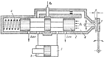 Для повышения чувствительности усилителя и обеспечения одновременно увеличения мощности выходного сигнала применяют двухкаскадные устройства, первой ступенью усиления которых является обычно усилитель типа сопло- заслонка, а второй - золотник. Принципиальная схема такого устройства показана на рис.9. Междроссельная камера a этой схемы соединена с правой полостью основного распределительного золотника, плунжер 2 которого находится в равновесии под действием усилия пружины 4 и давления жидкости в этой камере. Жидкость постоянно подводится в штоковую полость b силового цилиндра, поршень которого при одновременной подаче жидкости в противоположную полость перемещается вследствие разности площадей поршня влево, и при соединении этой полости с баком - в правую сторону.
