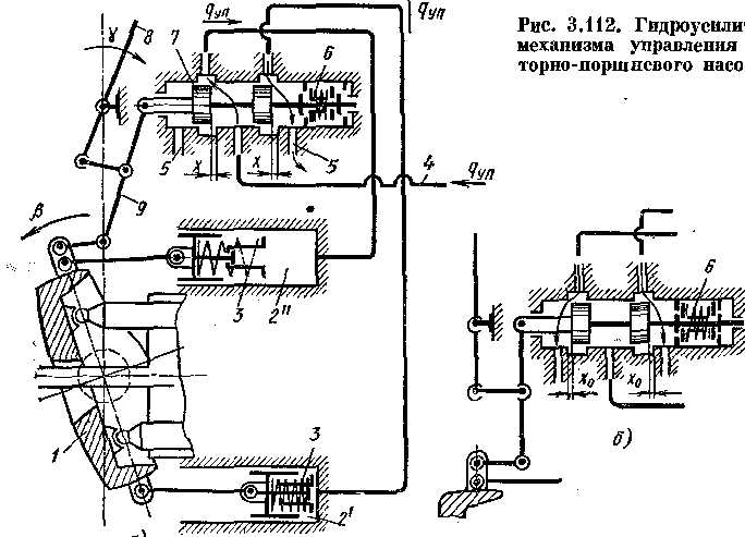 Схема широко распространенного гидроусилителя с рычажной связью между звеньями показана на рис. 3.1. В нем выходному звену, штоку 6, сообщаются движения, согласованные с определенной точностью с перемещением звена управления, Тяги 2, при требуемой усилении входной мощности.