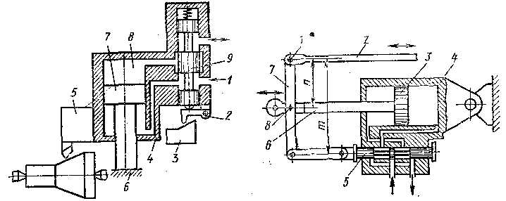 Схема простейшёго следящего гидропривода поперечной подачи суппорта копировального токарного станка показана на рас. 3. Суппорт 5 объединен с выходным звеном гидропривода — подвижным корпусом 4 гидроцилиндра, в котором размещено также звено управления — золотниковый гидрораспределитель 9. Поршень 7 гидроцилиндра закреплен на корпусе 6 суппорта. При продольной подаче суппорта щуп 2 скользит по копиру 3 и смещает гидрораспределитель, который открывает доступ жидкости из подводящей гидролинии 1 в большую полость 8 гидроцилиндра. Это вызывает смещение корпуса 4 с закрепленным на нем резцом, повторяющее смещение гидрораспределителя. При этом щель, соединявшая полость 8 с подводом 1 перекрывается, чем осуществляется прямая обратная связь выходного и задающего звеньев. Она восстанавливает равновесие в системе после исполнения управляющего сигнала. Непрерывное протекание процессов рассогласования и восстановления представляет слежение выходного звена за командой задающего.