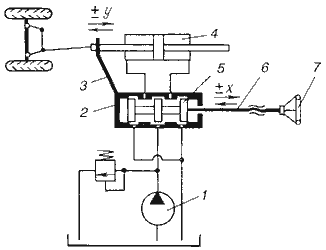 При прямолинейном движении автомашины все элементы системы рулевого управления находятся в исходном положении. Жидкость из насоса 1 поступает к гидроусилителю золотникового типа. Золотник 5 усилителя занимает нейтральное положение, а в обеих полостях исполнительного механизма 4 установилось одинаковое давление. При необходимости изменить направление движения автомобиля водитель поворачивает рулевое колесо 7. Связанный с рулевым колесом винт 6 перемещает золотник усилителя на величину x, вызывая рассогласование в системе. При этом проходные сечения одних рабочих окон усилителя уменьшаются, а других увеличиваются. Это создает перепад давлений у исполнительного механизма, а его поршень приходит в движение, перемещаясь на величину y и поворачивая колеса автомобиля. Одновременно через обратную связь 3 движение поршня передается на втулку 2 усилителя. Совокупность 2 и 3 является сравнивающим устройством. Втулка перемещается в том же направлении, что и золотник 5 до тех пор, пока рассогласование в гидросистеме, вызванное поворотом рулевого колеса, не будет устранено. При непрерывном вращении водителем рулевого колеса поршень со штоком будет также непрерывно перемещаться, вызывая соответствующий поворот колес. При этом небольшие усилия водителя, прикладываемые к рулевому колесу, гидроприводом преобразуются в значительные усилия на штоке поршня, необходимые для управления автомобилем.