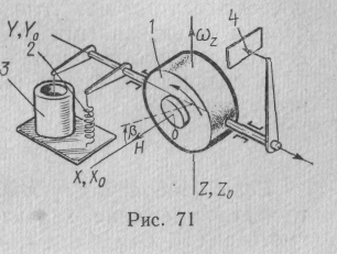 Принцип действия гиротахометра можно пояснить следующим образом. При появлении угловой скорости >г >поворота основания возникнет гироскопический момент. Вектор этого момента направлен по оси OY>0>.