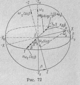 Составим дифференциальное уравнение движения гиротахометра в предположении, что существуют угловые скорости основания относительно всех трех осей прибора ОХ>0>, OY>0> и OZ>0> а измерить необходимо только угловую скорость >z> относительно оси OZ>0 >(рис. 72). При составлении уравнений учтем: