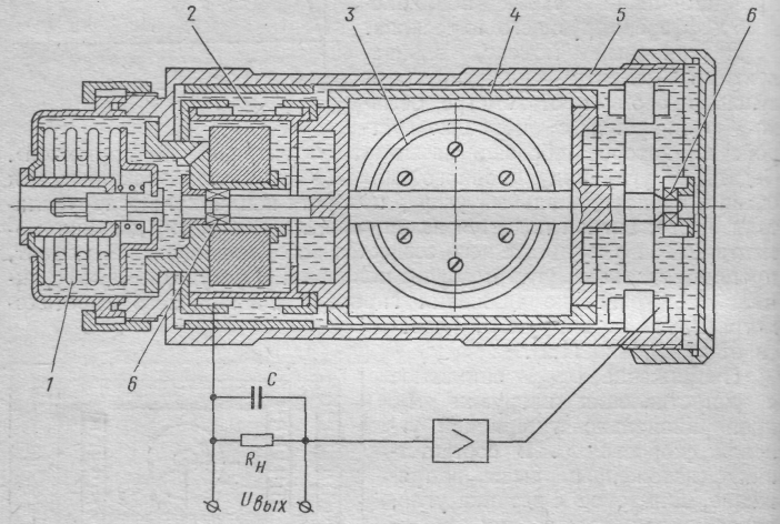 Современные гиротахометры в «сухом» подвесе дают возможность измерять угловые скорости от 0,1 до 10 град/с, а в поплавковом исполнении — в пределах 0,004—100 град/с (более широкий диапазон обеспечивается применением «электрической пружины»). Время переходного процесса от 0,01 до 0,2 с. На рис. 75 показана несколько упрощенная конструктивная схема поплавкового гиротахометра, где 1 — сильфон (для компенсации температурного расширения жидкости); 2—вязкая жидкость; 3 — гиромотор; 4-герметичный поплавок; 5—корпус прибора; 6—опоры поплавка.