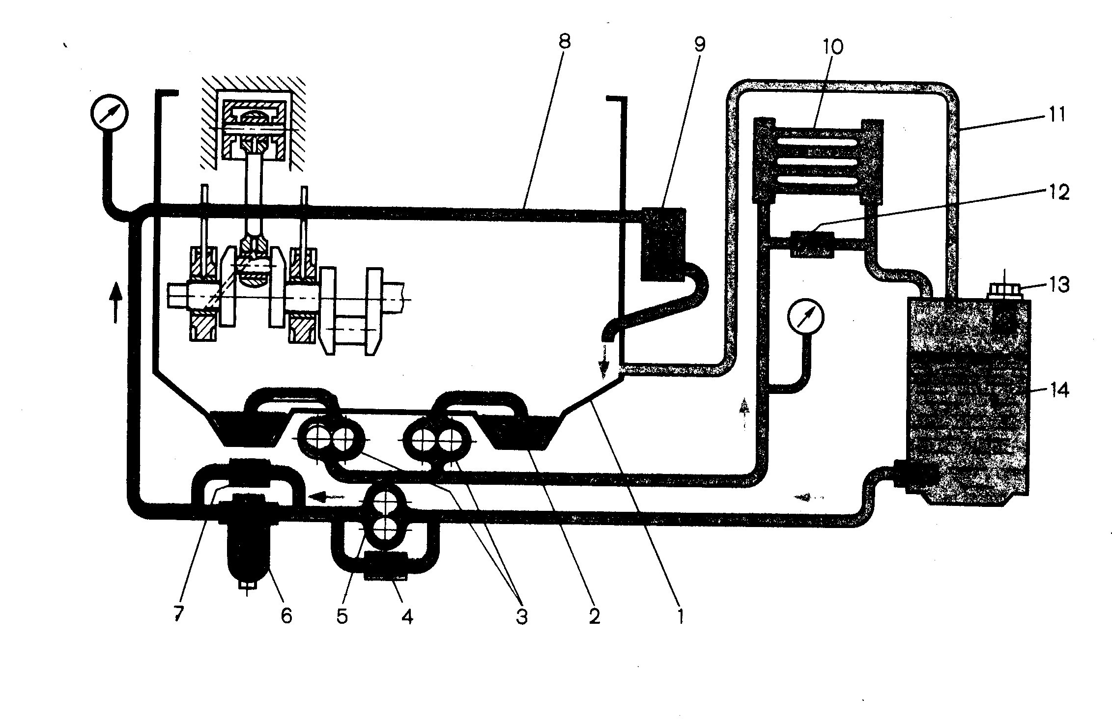 На рисунке видны дополнительные устройства смазочной системы с сухим картером, которых нет в системе с мокрым картером. Поддон картера или рама имеют по концам углубления, из которых масло откачивается двумя секциями 3 насоса с помощью двух маслозаборников 2 в наружный циркуляционный бак 14 через охладитель 10 по общему нагнетательному трубопроводу, что предотвращает засасывание пены одной из секций. Из циркуляционного бака в главную магистраль 8 двигателя масло подается с помощью нагнетательной секции 5 масляного насоса через полнопоточный фильтр 6.