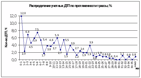 Примерно одинаковое количество ДТП (5,9 и 5,5%) регистрируется на участках км 10 - км 12 (Цигломень) и км 13 - км 14 (перегон, комбинация кривой в плане и горизонтального участка в профиле).