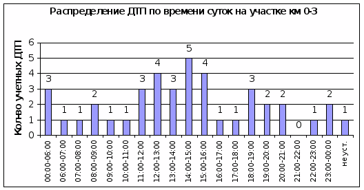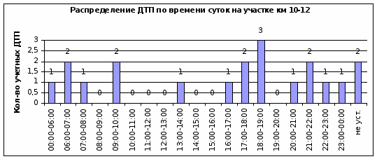 ДТП на участке происходят главным образом в период с августа по декабрь, относительно равномерно распределяясь в течение дня (см. Диаграммы 8 и 9).
