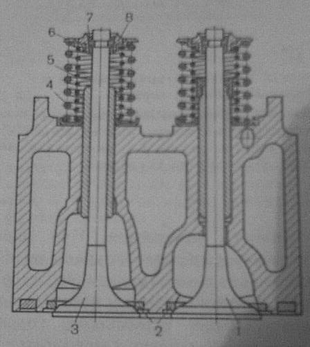 Рис.10. Клапаны, устанавливаемые непосредственно в головку цилиндра: 1 - впускной клапан, 2 - седла клапанов, 3 – выпускной клапан, 4 – наружная пружина, 5 – внутренняя пружина, 6 – тарелка пружины, 7 – сухарик, 8 – втулка.