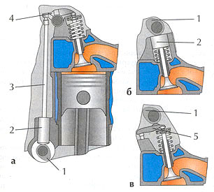 Рис. 2. Газораспределительные механизмы: а — с нижним расположением распредвала; б и в — с верхним расположением распредвала; 1 — кулачок; 2 — толкатель; 3 — штанга; 4 — коромысло; 5 — одноплечий рычаг.