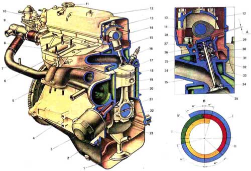 Рис. 14. Двигатель (поперечный разрез). 1. Приемник масляного насоса; 2. Масляный картер; 3. Масляный фильтр; 4. Блок цилиндров; 5. Выпускной коллектор; 6. Впускной трубопровод; 7. Подводящая труба насоса охлаждающей жидкости; 8. Теплоизолирующий экран карбюратора; 9. Термостат; 10. Топливный насос; 11. Крышка маслозаливной горловины; 12. Крышка головки цилиндров; 13. Передний корпус подшипников распределительного вала; 14. Распределительный вал; 15. Головка цилиндров; 16. Свеча зажигания; 17. Прокладка головки цилиндров; 18. Поршень; 19. Поршневой палец; 20. Шатун; 21. Вкладыш шатунного подшипника коленчатого вала; 22. Крышка шатуна; 23. Коленчатый вал; 24. Маслоотражательный колпачок; 25. Толкатель; 26. Сухарь клапана; 27. Тарелка пружин; 28. Регулировочная шайба; 29. Внутренняя пружина клапана; 30. Наружная пружина клапана; 31. Опорная шайба пружин; 32. Стопорное кольцо; 33. Направляющая втулка клапана; 34. Седло клапана; 35. Впускной клапан; 36. А.Зазор в механизме привода клапанов на холодном двигателе: 0,2 мм для впускных клапанов и 0,35 мм для выпускных; 37. В.Диаграмма фаз газораспределения; 38. I.Впуск горючей смеси; 39. II.Сжатие; 40. III.Рабочий ход; 41. IV.Выпуск.