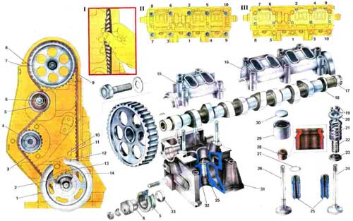 Рис. 13. Газораспределительный механизм. 1. Шкив на полипчатом валу для привода генератора; 2. Зубчатый шкив на коленчатом валу для привода распределительного вала; 3. Зубчатый ремень привода распределительного вала; 4. Шкив насоса охлаждающей жидкости; 5. Натяжной ролик; 6. Эксцентриковая ось натяжного ролика; 7. Установочная метка (усик) на задней крышке зубчатого ремня; 8. Установочная метка на шкиве распределительного вала; 9. Шкив распределительного вала; 10. Метка опережения зажигания на 5° на передней крышке зубчатого ремня; 11. Метка опережения зажигания на О'; 12. Метка ВМТ на шкиве привода генератора; 13. Установочная метка на крышке масляного насоса; 14. Метка ВМТ на зубчатом шкиве коленчатого вала; 15. Передний корпус подшипников распределительного вала; 16. Задний корпус подшипников распределительного вала; 17. Эксцентрик на распределительном валу для привода топливного насоса; 18. Распределительный вал; 19. Сухари клапана; 20. Тарелка клапана; 21. Наружная пружина клапана; 22. Внутренняя пружина клапана; 23. Опорная шайба пружин; 24. Впускной клапан; 25. Направляющие втулки клапана; 26. Выпускной клапан; 27. Стопорное кольцо; 28. Маслоотражательный колпачок; 29. Толкатель клапана; 30. Регулировочная шайба; 31. Головка цилиндров; 32. Седло клапана; 33. Дистанционное кольцо; 34. I. Проверка натяжения ремня; 35. II. Порядок затягивания болтов крепления головки цилиндров; 36. III. Порядок затягивания гаек крепления корпусов подшипников распределительного вала.