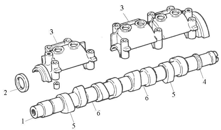 1 - распределительный вал; 2 – сальник; 3 - крышка подшипников распределительного вала; 4 – эксцентрик привода топливного насоса; 5 – кулачки; 6 – опорные шейки.