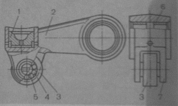 Рис. 12. Роликовый толкатель рычажного типа: 1 - пята, 2 – толкатель, 3 – ролик, 4 – игольчатый подшипник, 5 – ось ролика, 6 – втулка, 7 – вилка толкателя.