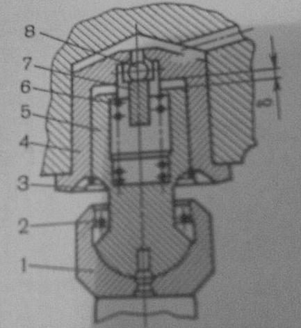 Рис 11. Гидравлический толкатель: 1- колпачок, 2 и 3 – стопорные кольца, 4 – втулка, 5 – плунжер, 6 – пружина, 7 – корпус клапана, 8 – шариковый клапан.