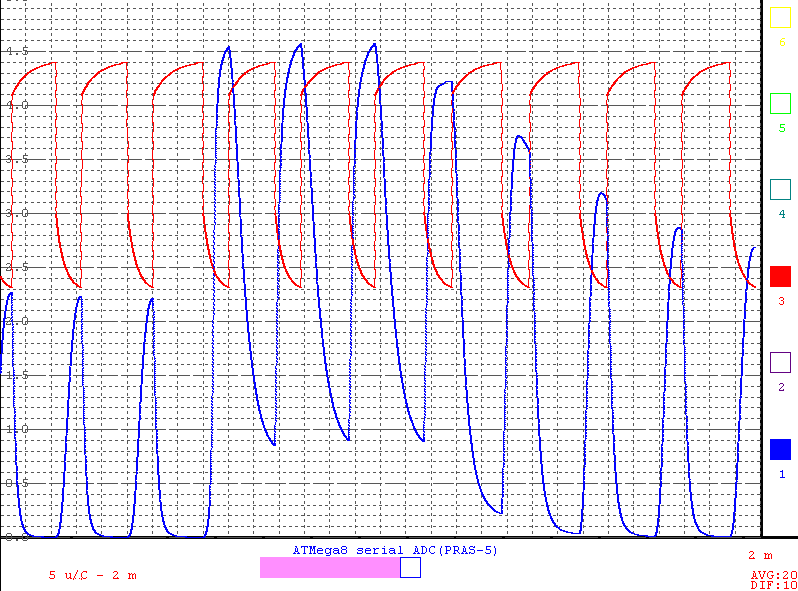 На рис.2.3 приведена зміна напруги на нагрівнику АЧЕ U>н> (червоний колір) та газочутливому шарі U>ш >(синій колір) при подачі на АЧЕ сигнальної концентрації метану - 0,5 % об. АЧЕ включений у схему вимірювання газосигналізатора ГСБ-01-4, який призначений для сигналізації наявності концентрації СО ≥ 50 ppm та СН>4> ≥ 0,5 % об. у побутових приміщеннях. Рівень сигнальної напруги ГСБ-01-4 у даному випадку відповідає значенню 4.5 на графіку. Підстроювання порогового значення U>ш> здійснюється підстроєчним резистором.