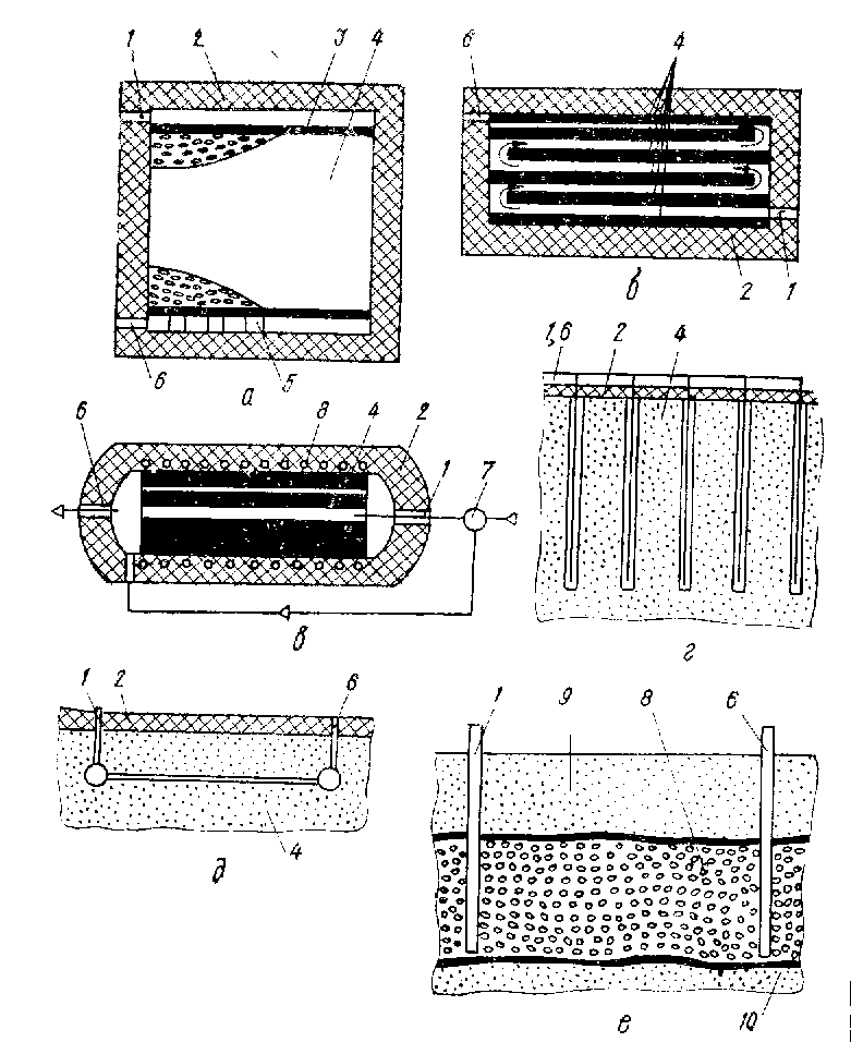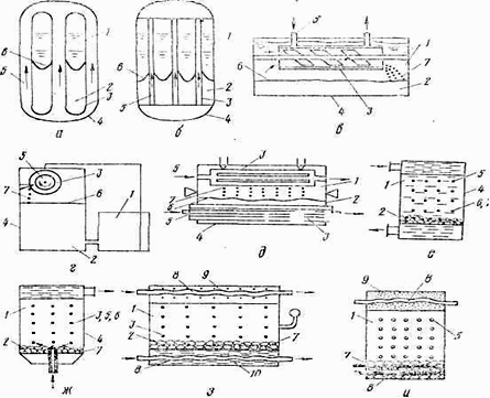 Рис.4 Основные типы тепловых аккумуляторов фазового перехода: а — капсульный; 6 —. кожухотрубный; в, г — со скребковым удалением ТАМ; д — с ультразвуковым удалением ТАМ; е, ж — с прямым контактом и прокачкой ТАМ; з, и — с испарительно-конвективным переносом тепла; 1 —жидкий ТАМ; 2 —твердый ТАМ; 3 — поверхность теплообмена; 4 — корпус ТА; а — теплоноситель; 6 — граница раздела фаз; 7 — частицы твердого ТАМ; 4— промежуточный теплообменник; 9— паровое и жидкостное пространства для теплоносителя.