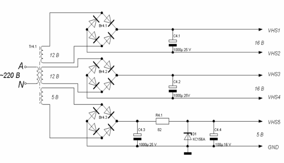 Блок питания (рис.10) построен по классической схеме. Необходимость применения трех каналов питания продиктована особенностью связи каскадов рекуператора с электрической сетью. При этом общим проводом можно лишь условно считать отрицательный полюс 5-вольтового выхода. Он не должен заземляться или иметь связь с проводами сети. Главным требованием к блоку питания является возможность обеспечить ток до 3 А на выходах 16 Б. Это необходимо для ввода мощных ключевых транзисторов в режим насыщения в открытом состоянии. В противном случае на них будет рассеиваться большая мощность, и они выйдут из строя.
