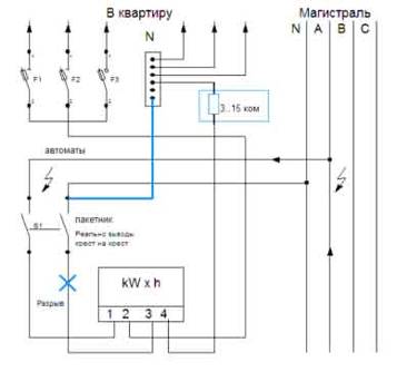 Как известно энергия учитываемая счетчиком определяется по формуле интеграл по времени U*I*COS. В этом способе изменяют величину U напряжение на обмотке или датчике счетчика. Для этого необходимо отключить нулевой провод от счетчика. Это достигается переламыванием жилы провода, не снимая изоляции. Для того чтобы предотвратить контакт концов жилы растягивают изоляцию и через шприц заливают в место разрыва клей, герметик. По перемычке синего цвета нормальный ноль подключается к квартире. Так иногда делают электрики при поломке пакетного переключателя, на учет это не влияет, затем в нулевой провод, идущий от счетчика к нулевой колодке надо врезать сопротивление 3...15 кОм (зависит от желания, на сколько "снизить" учет и от сопротивления обмотки напряжения счетчика). Мощность сопротивления достаточна 1. .3 Вт, надежный контакт тоже не требуется. Врезку можно сделать, разрезав провод прикрутить сопротивление, все согнуть и хорошо замотать изолентой, чтобы было похоже на обычную скрутку. Изменяя величину сопротивления можно менять погрешность счетчика от 0 до - 100%. Погрешность счетчика в 99.9% при проверках не проверяется. Двух полюсный индикатор будет показывать, что ноль есть.
