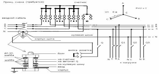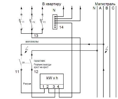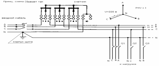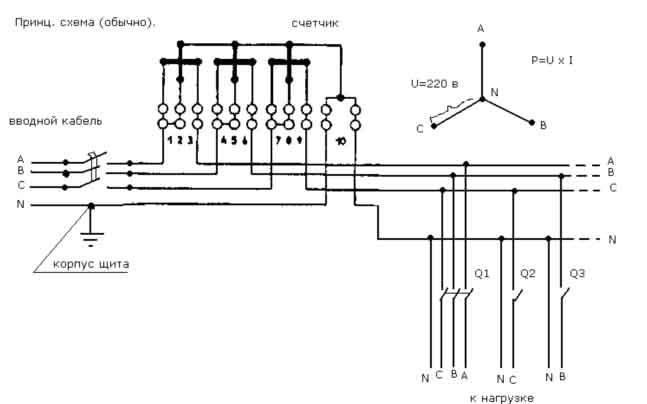 Трехфазная нагрузка же будет учитываться счетчиком, как и раньше, полностью т.к напряжение на других лучах звезды (не в сети) повысится на корень из трех. В случае проверки даже если не выключить автомат Q или прибор из розетки, работник энергосбыта перед проверкой сам отключит автомат Q. Ну а если прибор выключен то и придраться к схеме не возможно.